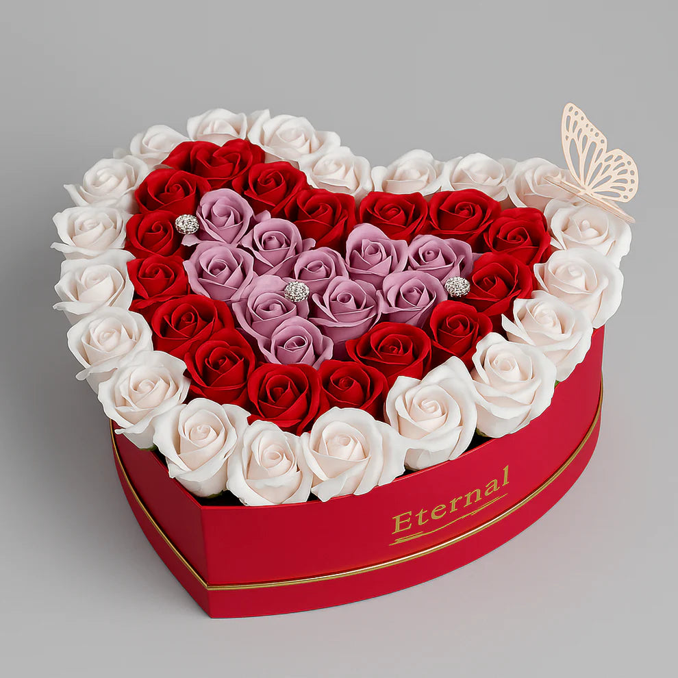 Transformă orice moment într-o declarație de iubire cu aranjamentul floral "Amour de Luxe". Realizat cu flori de săpun fine, în nuanțe romantice de roșu, alb și roz, acest aranjament vine într-o cutie elegantă în formă de inimă, inscripționată cu „Eternal” – simbol al iubirii care nu se stinge niciodată.