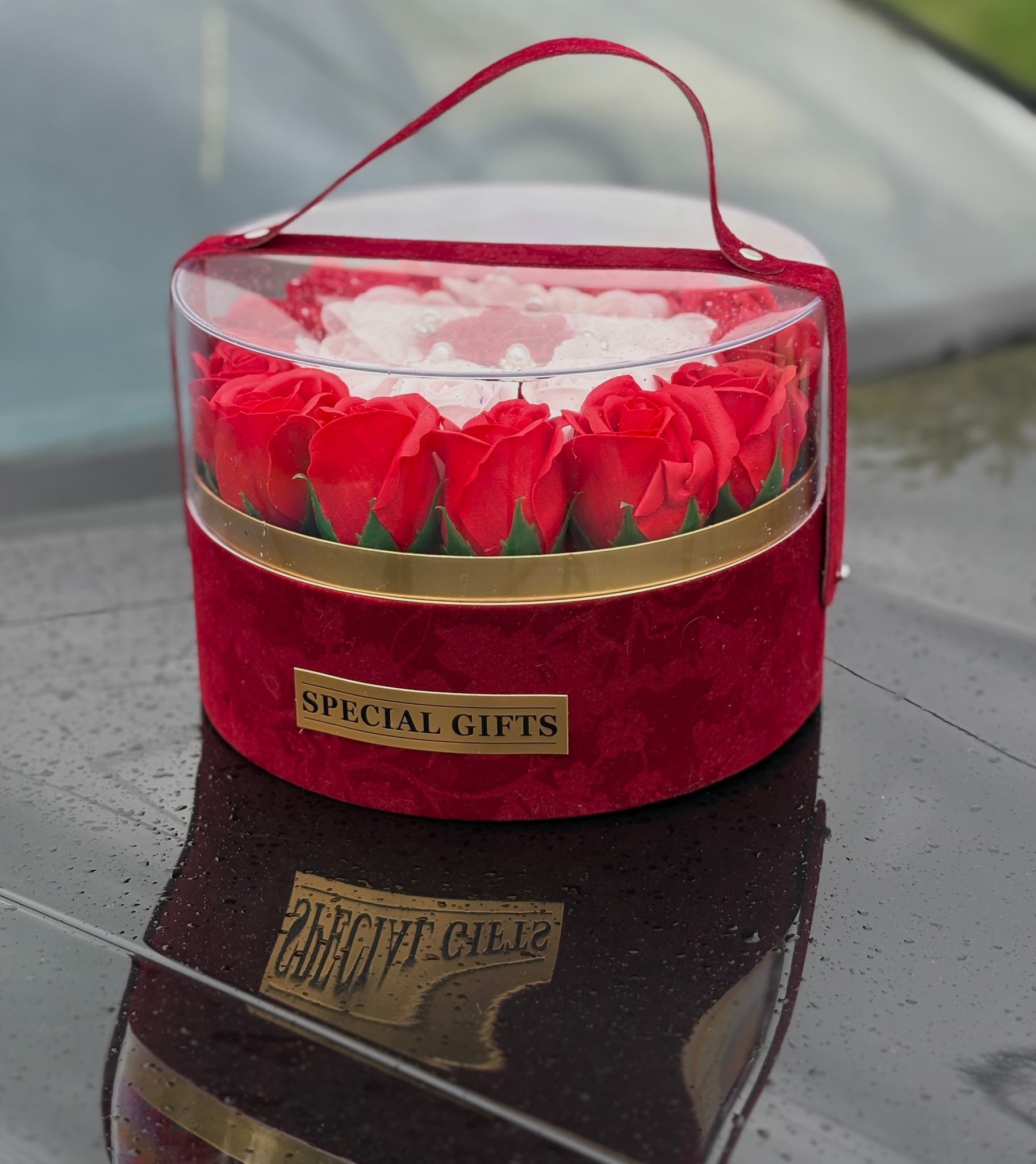 Creat cu grijă și atenție la detalii, fiecare cutie conține trandafiri atent aranjați, combinați în nuanțe de roșu pasional și roz delicat, completate de perle discrete care adaugă un strop de strălucire și rafinament. Cutia din catifea roșie, cu accente aurii și detalii premium, transformă acest cadou într-un simbol al iubirii și al prețuirii.